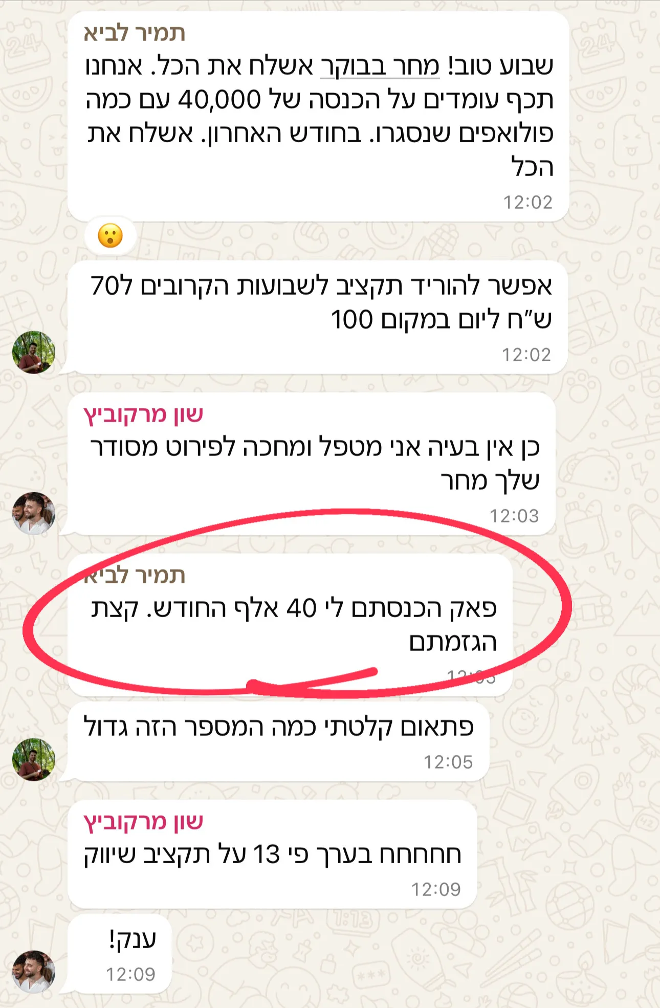 והחזון שלנו זה לקחת כמה שיותר עסקים ולהביא אותם מהכנסות של 30 עד 50 אלף שקלים בחודש למעל 100,000 שקלים בצורה רווחית ויציבה